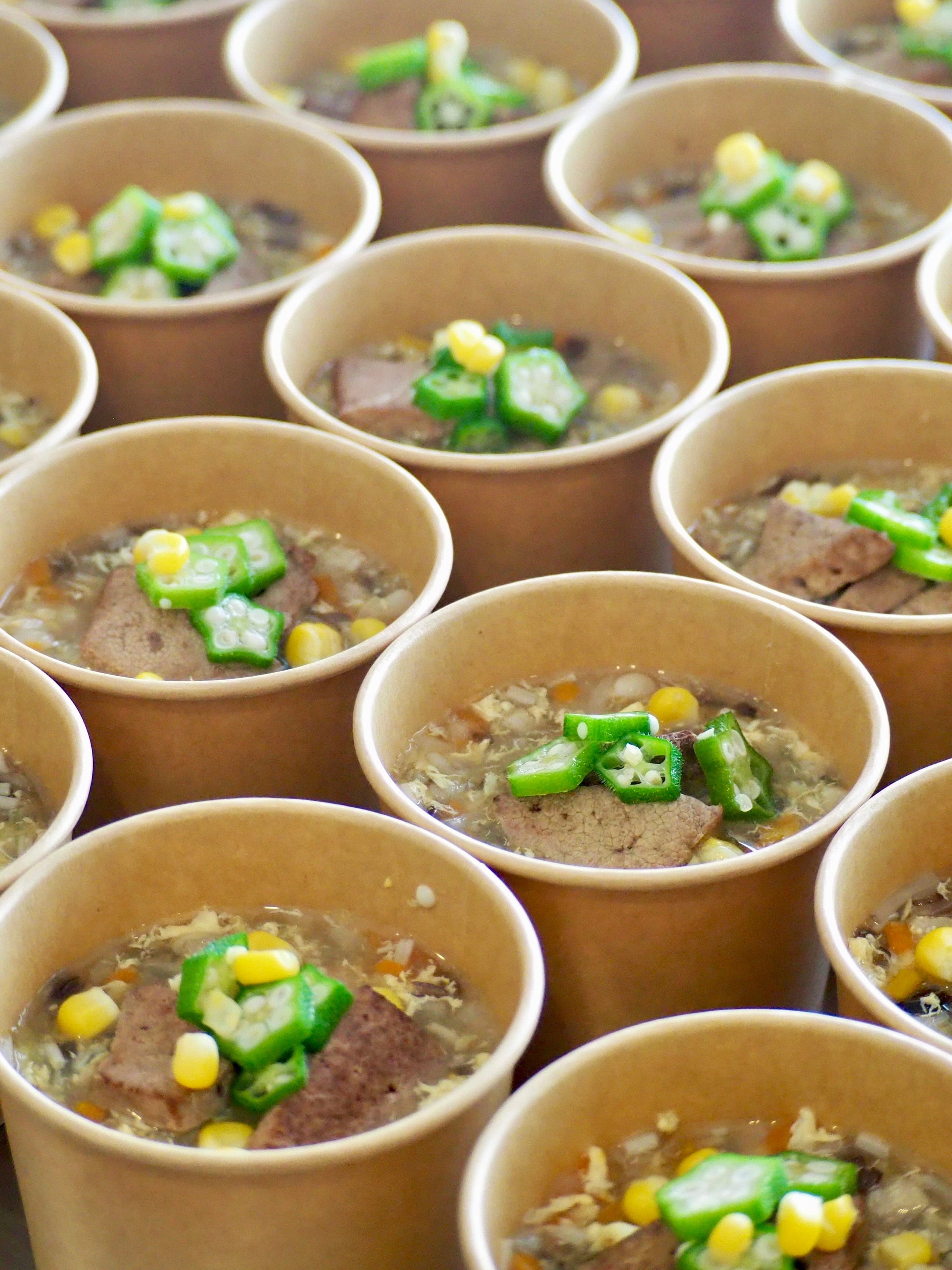 スープ(豚レバー)、冬瓜、もやし、えのき、豚レバー、人参、白菜、鶏卵、きくらげ、オクラ、スイートコーン、本葛粉