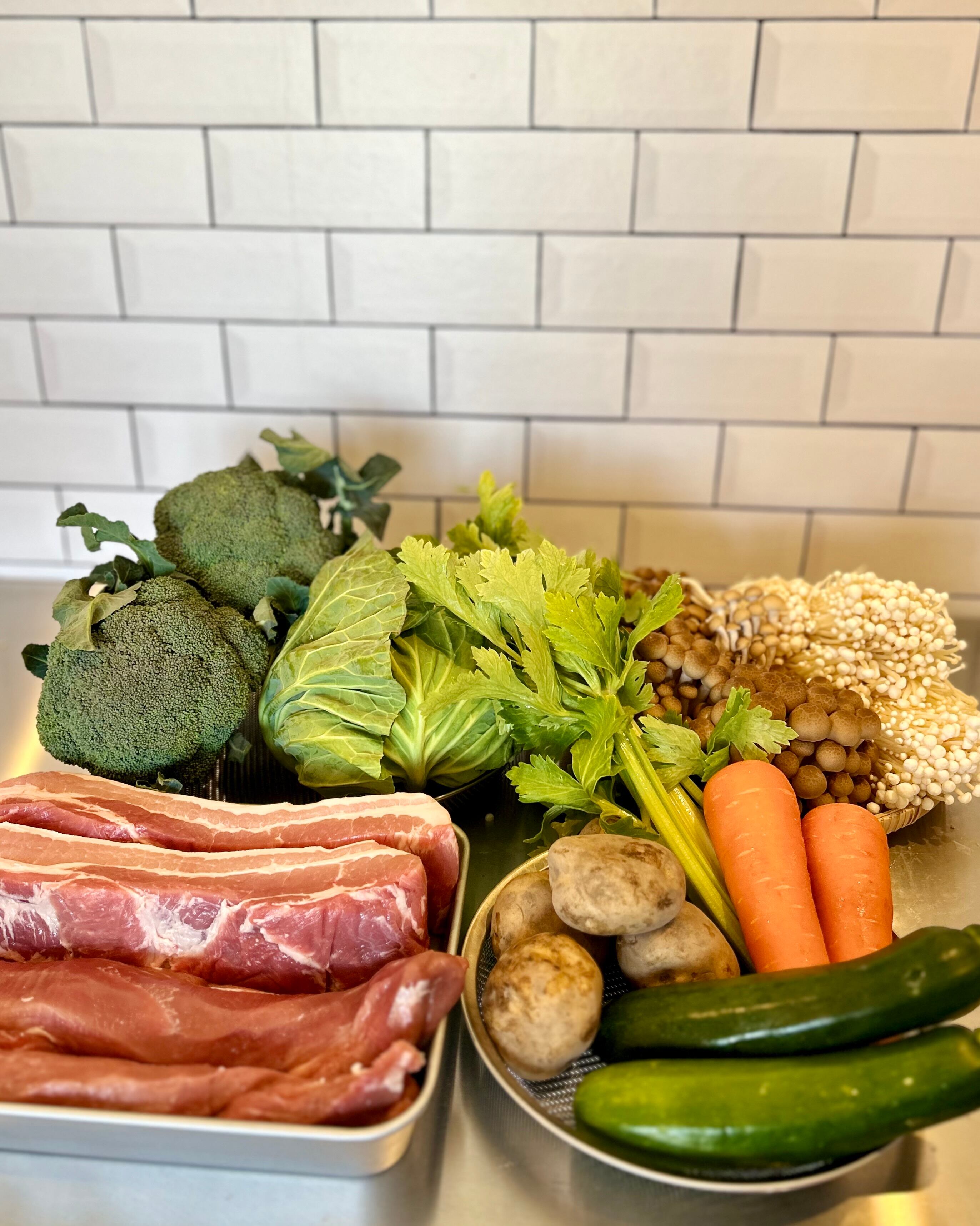 スープ(トマト、トマトピューレ)、豚肉(ロース、ヒレ)、白菜、ブロッコリー、しめじ、人参、小松菜、里芋、セロリ、パルメザンチーズ、パセリ