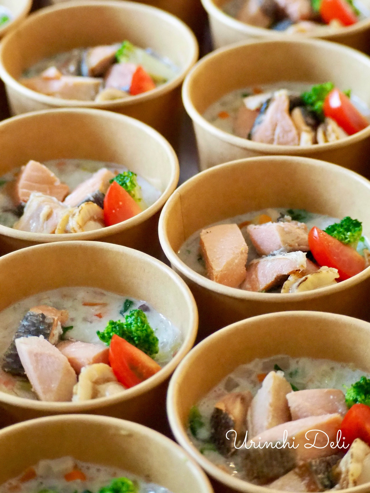 スープ(豆乳、鮭)、鮭、白菜、大根、エリンギ、人参、小松菜、米、帆立、ミニトマト、ブロッコリー、本葛粉