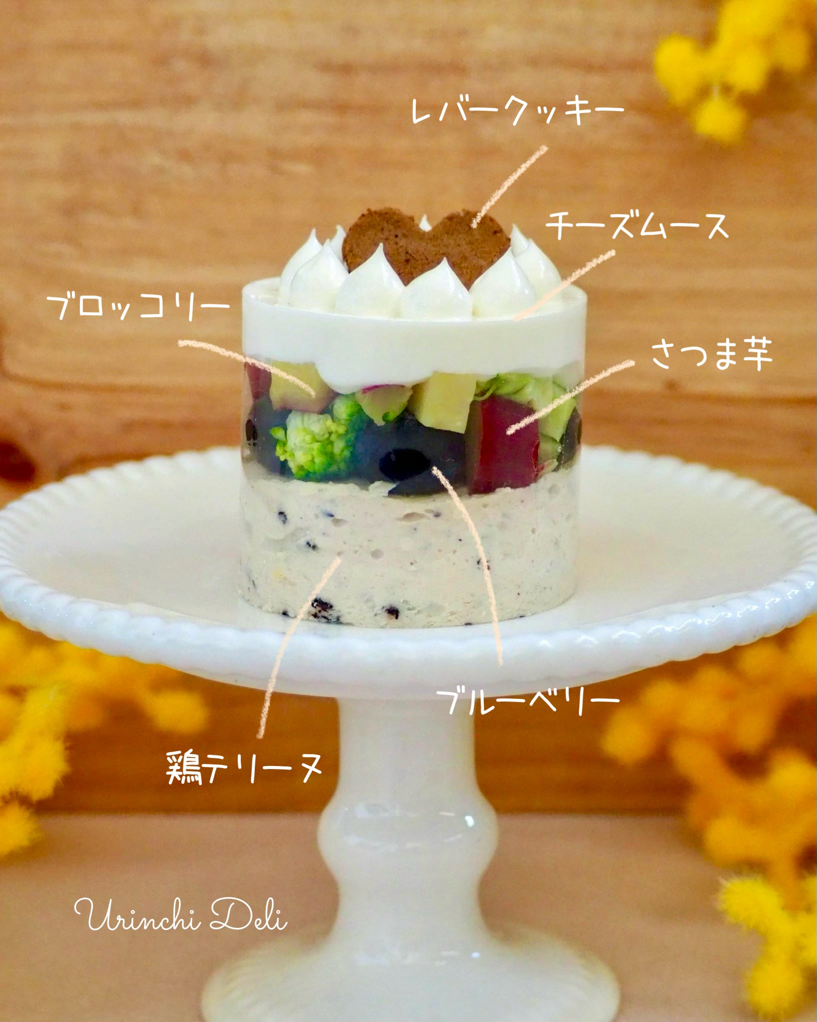 チーズムース(ヨーグルト、クリームチーズ、豆乳、ゼラチン)、鶏テリーヌ(鶏むね肉、豆乳、鶏卵、エリンギ、ひじき)、さつま芋、ブロッコリー、ブルーベリー、レバークッキー(鶏レバー、さつま芋、米粉、EXオリーブオイル)