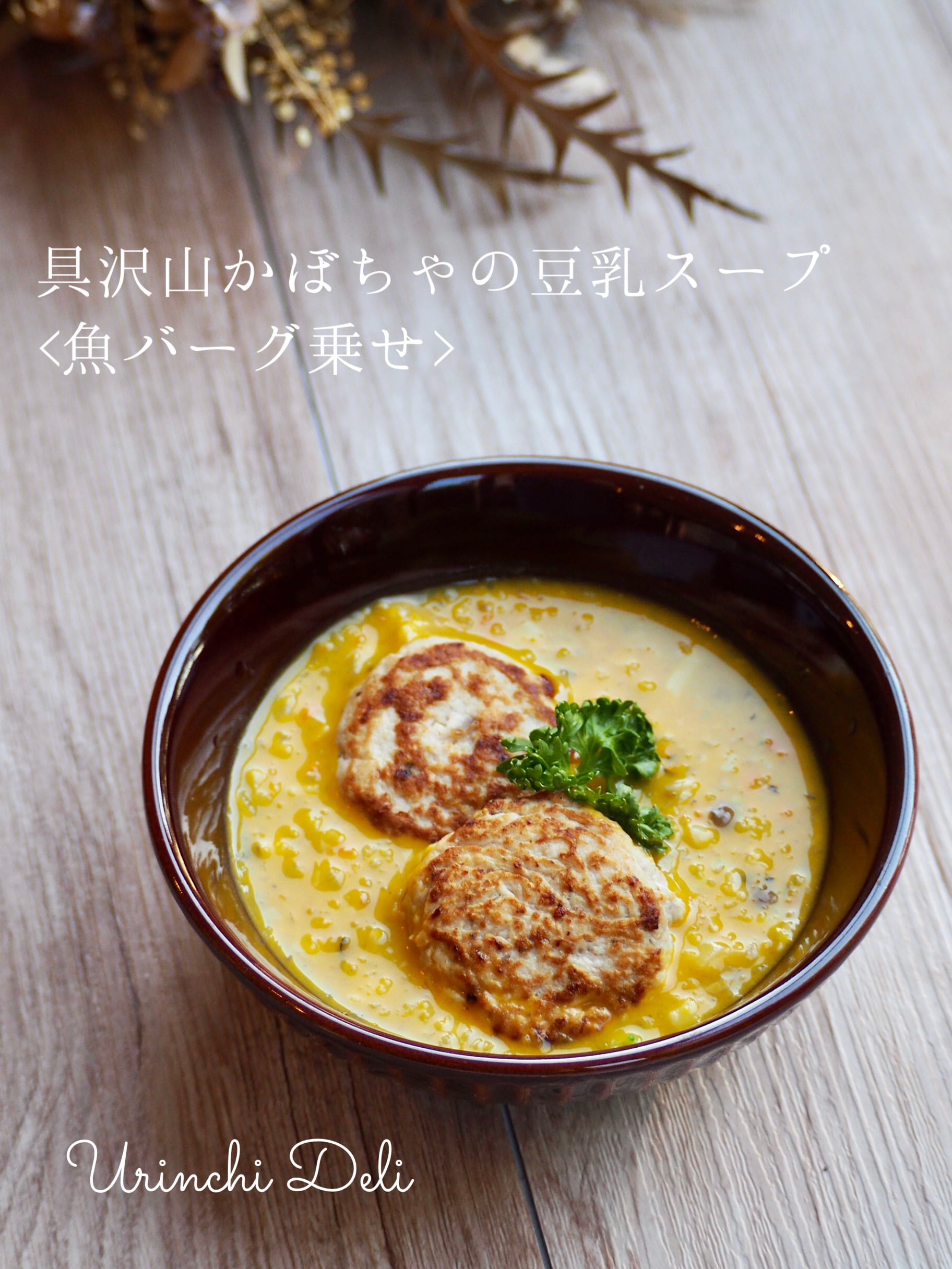 スープ(かぼちゃ、豆乳)、魚バーグ(ビンチョウマグロ、豆腐、しめじ、卵、生姜)、エリンギ、キャベツ、蓮根、大根、しめじ、人参、かぼちゃ、パセリ