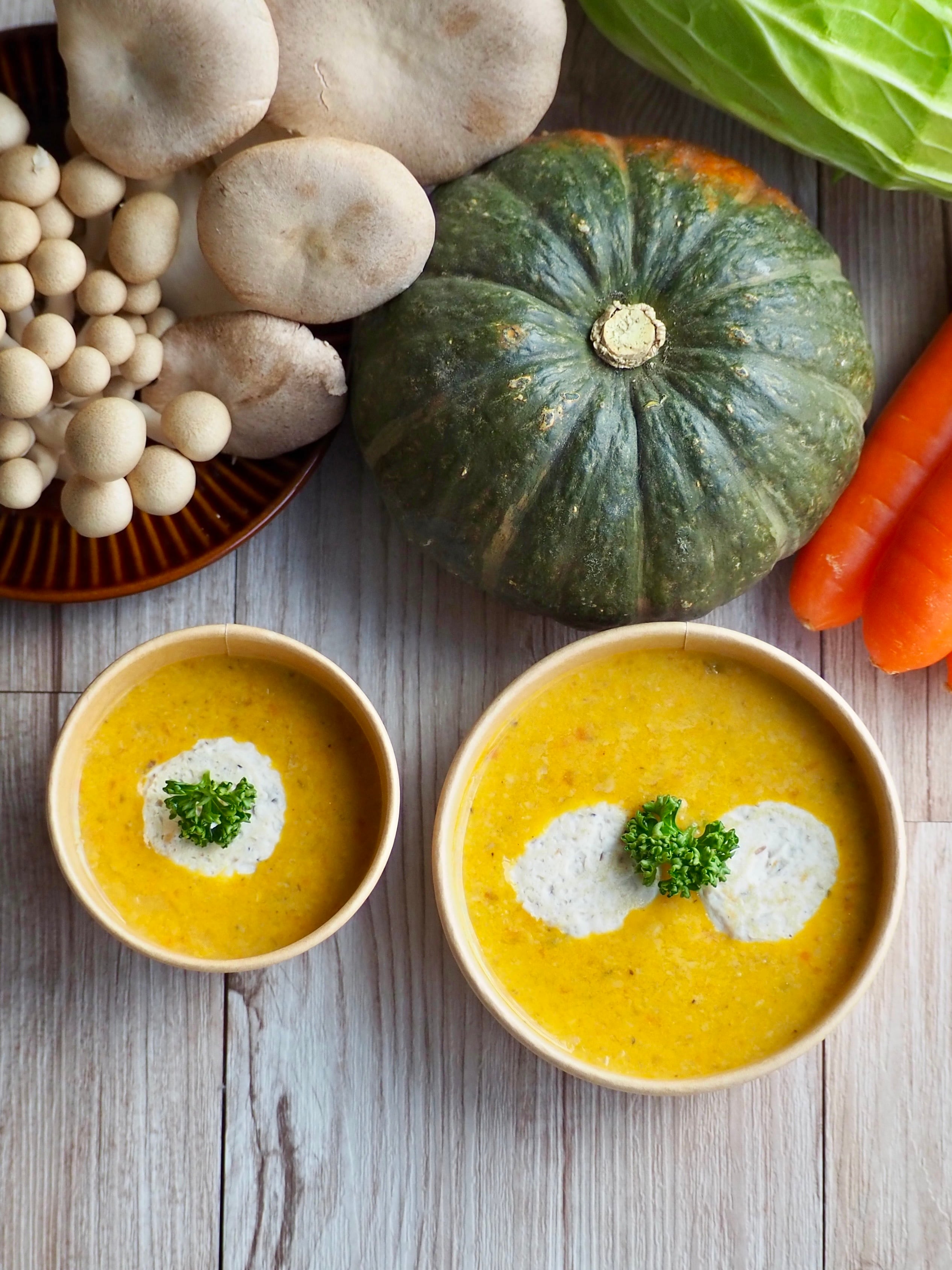 ほくほくの甘いかぼちゃを有機豆乳で優しく伸ばして具沢山の滑らかなスープを作りました。優しいお味のパンプキンスープです。
